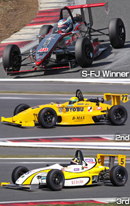 決勝は各車好スタートを決めるがオープニングラップの1コーナー先で2台がコースアウト。S-FJクラスでは予選でもポールの48松井孝允がそのポジションを譲らず徐々に2位以下に差をつけ、さらに周回を重ねるごとにファステストラップを出しながらチェッカーまで快走を続ける、そこに77DRAGON、5中嶋修と続いた。