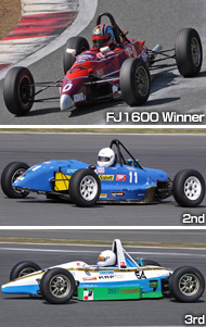 FJ1600は3番手スタートの0渡辺義人が好ダッシュでトップに立ちその座を譲らずにチェッカーを受け、続く2番手〜4番手は序盤から激しい争いに、2位は予選14位から追い上げた11麓悠太郎、3位には54柿島昭一が入った。