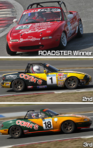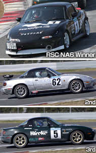 3クラス混走だがクラスごとに集団となりこちらもクラスごとにかなりの激戦となった。まずロードスターNA6クラスではスタート直後から混戦模様でスタート直後1コーナーまでに接触などがあるほどの激しいレース。1周目を終えてストレートに戻ってきたのは1雨宮恵司、65高橋和雄、4宮下進の順。その後徐々に1雨宮が引き離しにかかってきたと思われたが中盤から54高橋が何度もファステストラップを出しながら怒涛の追い上げにかかり、10周レースも残り一周となった9周目にヘアピンで65高橋が1雨宮を抜かしトップに立ちそのままチェッカーを受けた。