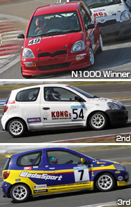 N1000クラスこちらもかなりの激戦、決勝中にも上位三台がコースレコードを塗り替えるといった争いながらも速いペースでレースが行われている。ストレートを抜けるたびにトップが入れ替わるような激しいレースを制したのは予選5番手から追い上げた49山口浩昭、続いて3番手スタートの54山田健、7深沢雅文という結果となった。