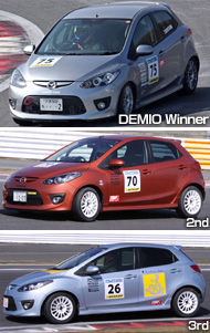 デミオクラスはこちらもかなりのデットヒートとなり、各所で3台〜4台が並んでコーナーに入っていくような見ごたえのあるレース光景が繰り広げられてそれを制したのは75西山隆、そこに70古閑宏、26佐藤和洋と続いた。