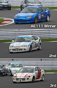 AE111 第2戦 予選でポールポジションの座を決めたのはポイントリーダーの7号車C千葉千自総大エンドレスレビンの市丸聡、2’02,060のタイム、そこに続くのは22号車IDIマルヨシ・フルスロレビンの宮崎敏、90号車千自総大ロフティPハートトレノの本吉正樹の順。このクラスも毎回強豪揃いで激しい上位争いの見られるレースが続いているが、今回もまたそのような展開になりそうなメンバーが揃っている。
