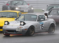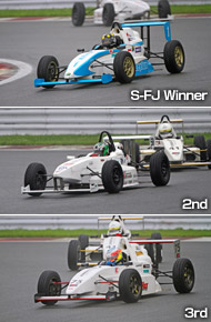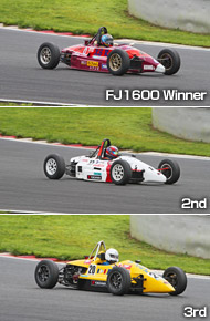 Super FJ / FJ1600 第4戦 前レースのロードスターレースまで降っていた雨もこのクラスがスターティンググリッドに付く頃には徐々に小雨に変わり、フォーメーションラップが始まる頃には完全に上がったが、路面はまだハーフウェット状態、12周のレースの中でどれだけ条件が変わっていくか、ドライバーにとって難しいレースになりそうだ。