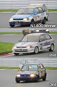 N1400 / N1000 / DEMIO (N1) 本日最後のレースとなったN1400/N1000/デミオ(N1)クラス、午前中の予選でトップだったのはN1400クラスコースレコードを更新した31号車MIDLANDμ日建重機82の黒須聡一、2番手には33号車HMP★東伸★ED★EP82の船木宏。N1000クラスのトップは7号車WEDSアドバンEDヴィッツの松波太郎。デミオ(N1)は阿部組WMデミオRPM/HのR.P.M/Hがトップからのスタートとなる。このクラスも毎回とても激しいレースとなるが、今回もまたとても見どころ満載の激しい争いとなった。