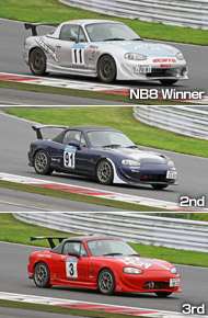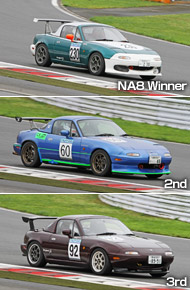 ロードスターカップ NA6 / NA8 / NB8 第3戦 3クラス混走のこのカテゴリー、総合でポールポジションの座を射止めたのはNB8クラス1号車JoyアクレMotys☆NB8の戸田裕一、開幕2連勝でポイントリーダーだ。続いて2番手からスタートとなったのは、NA8クラストップの230号車samsμNA8ロードスターの石渡幸治、こちらも2連勝、NA6クラストップは総合7番手スタートの882号車K2R桑原精肉店IDINA6の杉岡尚人。