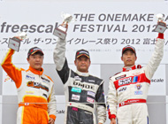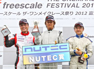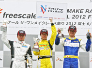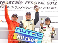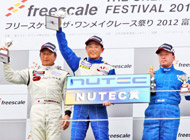 MUGEN POWER Cup CIVIC One Make Race Series 2012 第3戦無限パワーカップ シビックワンメイクレースシリーズ2012は全5戦中の今回が第3戦。予選でのトップは7オートバックスG-7HDCIVICの大西隆生、今回は表彰台常連が2番手グリットからのスタートとなりかなり白熱したレースになりそうだ。スタートを上手く決めたのはやはり4番手スタートでランキングトップの4 BRIDE・ED・PETRONAS・FD2の太田侑弥、1周を終えたところで2番手まで浮上。その後2周目にはトップに立ちそのまま逃げ切った。2位に入ったのは72サージェント・ED・EUROFD2の谷口行規、続いて88 SSR制動屋カーコンビニ88FD2の牧田克哉が予選12番手から3位表彰台。4太田は「上手くいきましたが後ろが谷口君だったのでとにかくミスをしないように走りました」とコメント。