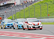 Netz Cup Vitz関東シリーズは今回が第2戦、予選でトップになったのは、13 DjacWmヴィッツMLの蓬田昭男、そこに62 N群馬FK光生APPVitzのデパマン石渡、8 東京IRC石松μMLVitz絆のイシカワヨシオの順。全44台のエントリーだ。決勝レースは日曜日の10:45スタート、この頃には小雨も上がり気温26℃路面温度35℃と少々蒸し暑くなってきた。スタート直後から上位陣は激しい戦いになり、3周目には62デパマン石渡が前に出るも最終ラップで13蓬田が抜き返し優勝。3位には予選11番手から追い上げてきた5 N東埼玉EDワコーズVitzの小野田貴俊が入った。13蓬田は「前回2位スタートが4位になってしまって悔しかったので今回はすごく嬉しい!」と語った。