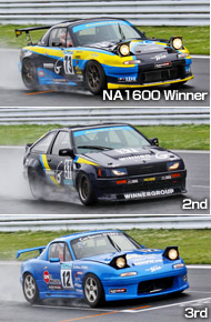 MR2・NA1600・N1600シリーズの開幕戦、まず土曜日に雨の中行われた予選で総合トップになったのは、NA1600の37 四季の森歯科IDIウィナーG86の秋元優範、99バウアーハウスR・AE92 竹内秀伸が続く、MR2では3 MSPLアクレMOTYSMR2の土取謙太郎がトップ、N1600では240 ガレージアネックス・μ・レビンの山口崇がトップでそこに40 ASやなぎもとIDI86レビンの柳本文彦が続く。スターティンググリットはいつものように、NA1600クラスが1〜3列グリット、6列空けてMR2クラス、そこから8列空けてN1600クラスとなっている。各クラスマシンのスタートダッシュ性能を見越しての措置だが、レースが始まるとこれでも混戦になってくるのが混走レースの見どころだ。雨が降り続ける中決勝がスタート、1コーナーでポールスタートの37秋本と2番手スタートの99竹内がコースオフ。ここでトップに立ったのが3番手スタートNA1600クラス73 ウィナーグループIDIユーノスの小宮伸介。その後追い上げて前半こそ37秋元とバトルとなったが、レース中盤にもう一度73小宮がトップに立ったあとは徐々に引き離し、8秒差でチェッカーを受ける。MR2は3番手スタートの4 文祥堂アクレ柳本ダイエーMR2の阿部恵一がオープニングラップでトップに出るものの、すぐに3土取にその座を奪い返され、3土取、4阿部、26藤永の順でチェッカー、N1600は240山口がトップのままチェッカーを受け、そこに3番手スタートの36 SEASHOREアクレWレビンの大石重之が続き41中村が3位となった。このクラスも長年レースを続けてきている仲間達が表彰台常連なので、和気藹々のレース終了後コメントでは優勝した73小宮が「秋元さんが、師匠を立てて譲ってくれました」と笑いを誘った「でも実際は小雨が降っていたのでけっこう滑って大変でした」と楽しみながらも大変だったレースを振り返っていた。
