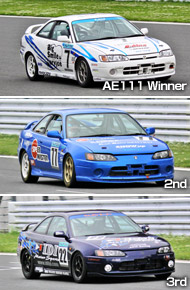 今回が開幕戦のAE111レビン/トレノ、今シーズンも全4戦で行われる。エントリーを見てもやはりベテラン勢が上位にきているが、マシンの成熟度やドライバーの腕前を見ても、今年も面白くなりそうだ。前日の予選でポールポジションを獲得したのは、7 C千葉千自総大エンドレスレビンの市丸聡で、昨シーズンのシリーズ3位のドライバー。そこに22 IDIマルヨシ・フルスロトレノの宮崎敏、78 藤和ケミカルTakadaトレノ 冥賀直文と続く。決勝は今大会最後のレースとなる16:15スタート。この時には愚図ついていたお天気も持ち直し、路面は完全にドライコンディションになっている。スタートで1コーナーを押さえたのは予選トップの7市丸、22宮崎、78冥賀の順、3周目に4位スタートの77SPM☆μ☆UETAKEトレノのなかむらたかひろが78冥賀を捕らえて3番手に上がってくる。レース中盤ではこの77なかむらがファステストラップを更新しながら5周目には2番手を走行している22宮崎の前に出た。後半も77なかむらと22宮崎の激しい2番手争いが各所で見られたものの、徐々に差を広げ、7市丸、77なかむら、22宮崎の順でチェッカーを受けた。 レース終了後7市丸は「レースもマシンもタイヤもきつかったです。前半のトップ争いからなんとか抜けて、後ろが2番手争いをしていてくれたおかげで勝てました。混戦の中での優勝なので、とても嬉しいです」と話していた。