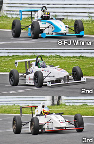 今大会で第3戦を迎えたSuper-FJ、FJ1600レース、S-FJのここまでのシリーズランキングは75B-MAXイエローダック10V 上別府将司が28ポイントでトップ、1ポイント差で昨年ダントツの速さでチャンピオンを取った1 LEYJUN筑波ガレージ10VのOSAMUが続き、第2戦で優勝した58 Rnスポーツ尾川KKS2制動屋 石川京侍が3位、今シーズンはまだまだ混戦の予感だ。FJ1600は今回出場していない99中嶋香子と12オートルックEVOLEX・SKの北野正規がそれぞれ20ポイントで同点トップ。土曜日に行われた予選でポールを取ったのは58 石川、そこに1 OSAMU、41 B-MAX・ED10Vの今井龍太、ポイントリーダーの75上別府は10番手からのスタート。FJ1600のトップはベテラン3 プロジェクトKKマースSK96の川村正徳がトップ、12北野は3番手からのスタートとどちらのクラスも面白いレースになりそうだ。決勝は日曜日の朝一番のレース、天候は曇り、気温21℃路面温度28℃のコンディションの中スタートがきられた。好スタートをみせたのは1 OSAMU、トップで1コーナーへきえて行く、ポールからスタートの58石川もそこに続くがなかなか抜けない、後ろの3番手争いも41今井と36太田達也が争っている。FJ1600では1周目にトップに立った12北野が順調に周回を重ねてそのまま優勝。S-FJは逃げ切った1OSAMUが優勝、58石川が2位、追い上げてきた75上別府が3位に入った。レース終了後S-FJ 1 OSAMUは「トップにたつものの後ろは引き離せないしとても疲れました」と話しFJ1600 10 北野は「スタートで上手く決まりS-FJの後ろについてスリップが上手く使えたので引き離すことが出来ました。すごく嬉しい」と話していた。