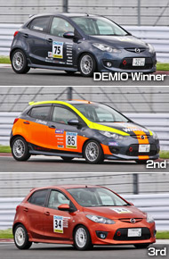 ロードスターカップNC・デミオレースも今回が開幕戦、ナンバー付き車両で行われる2車種の混走カテゴリーだ。このクラスは今回日曜日の朝、予選が行われて午後に決勝というスケジュールになっていた。予選でポールポジションを獲得したのは21 新井μおやぢRロードスターの新井敏克、続いて18 JOYMotysロードスター ランマン、64Joy☆abMoty’sNC 芝本淳。デミオクラスではトップが75 145デミオ改WithSKRの西山隆、24 MMレーシング&おやぢRデミオ オブチマサヒト、34 TR-Factoryデミオ 常盤岳史となっている。オープニングラップをトップで戻ってきたのは64芝本、21新井、18ランマンの順、しかし上位陣の争いは毎周回各所で続く、一旦3番手までなった21新井が周回を重ねるごとに徐々に追い上げ、7周目にはまたトップの座に戻り予選4番手から追い上げてきた8 ド☆ライダーロードスターの菊池聡がラストラップに2位まで追い上げ表彰台、3番手には64芝本というレース結果になった。デミオでは予選トップの75西山がそのまま逃げ切り2位以下に1’10.277の大差をつけて優勝、2位には85 WAKO’S高岸デミオが入り、34 常盤は3位になった。レース終了後21新井は「スタートでクラッチが上手くつなげられなくて遅れてしまった。失敗はしたけれども、追い上げがとても楽しかったです。暑くて疲れました」と汗だくになりながらも楽しかったレースを振り返っていた。デミオの75西山は「冬場にかなり練習を積んだので、その成果が出てとても嬉しいです。タイヤの選択などもすべて上手くいきました」とパーフェクトに上手く行ったレースを振り返って話していた。