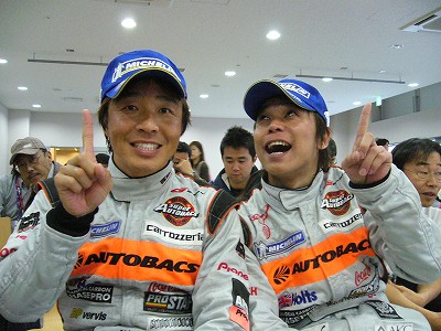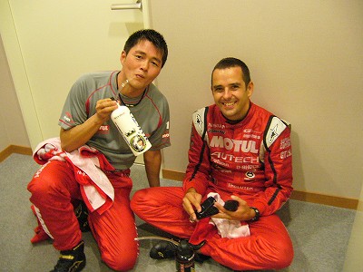 ゴールデンウイーク、皆さん楽しく遊んでますか? こちらはGT終了後のポディウム裏の勝者のみなさん。。 まずはGT500! 「MOTUL AUTECH GT-R」本山選手、ブノワ選手。