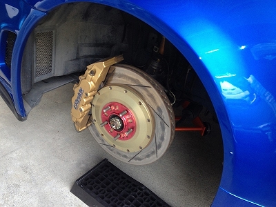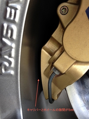 ですが、サーキット走行であれば、18インチで少しタイヤのハイトがあった方が、走り易いので、8ポットキャリパーに18インチホイールが装着出来るかフィッティングしてみました。↓