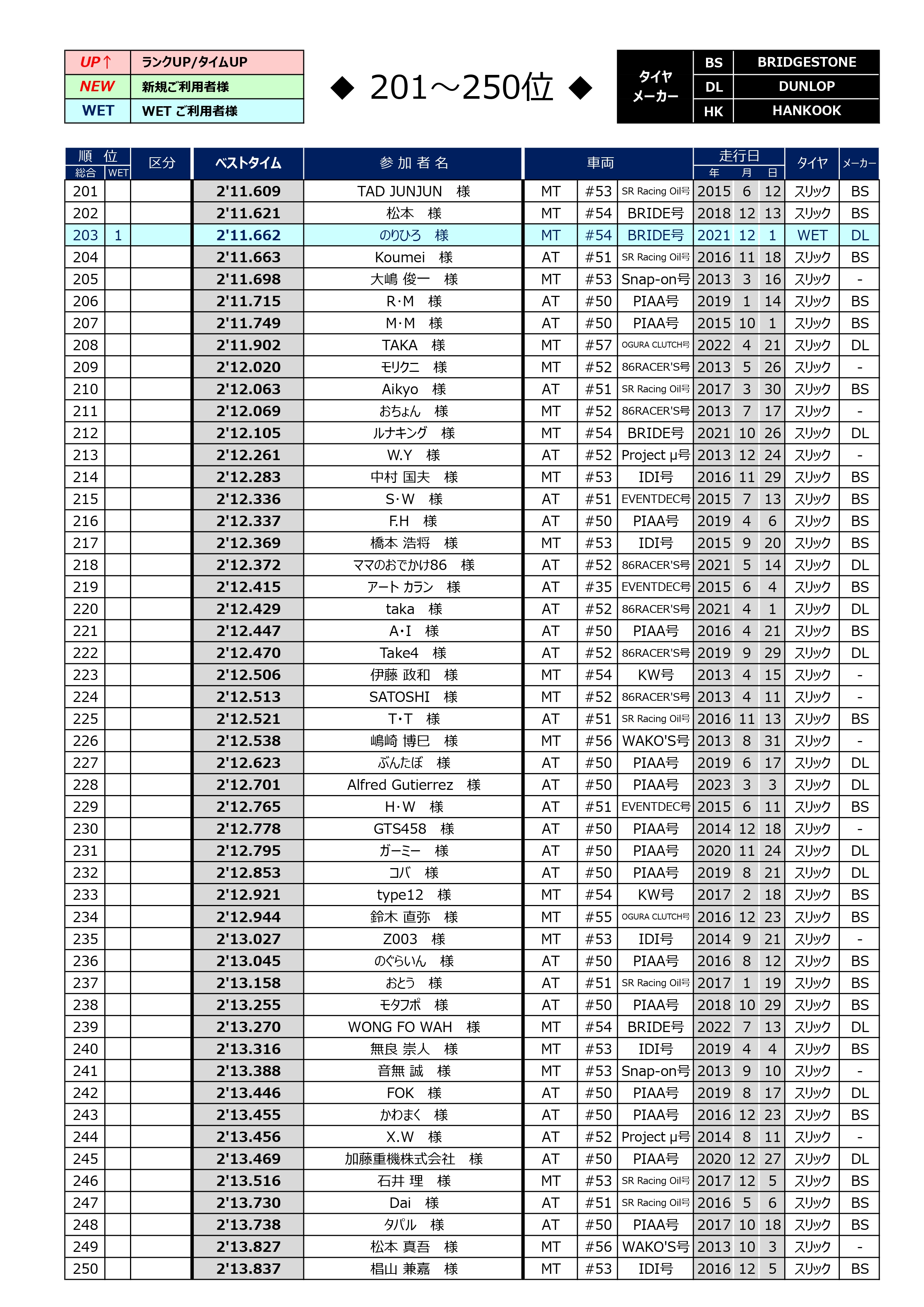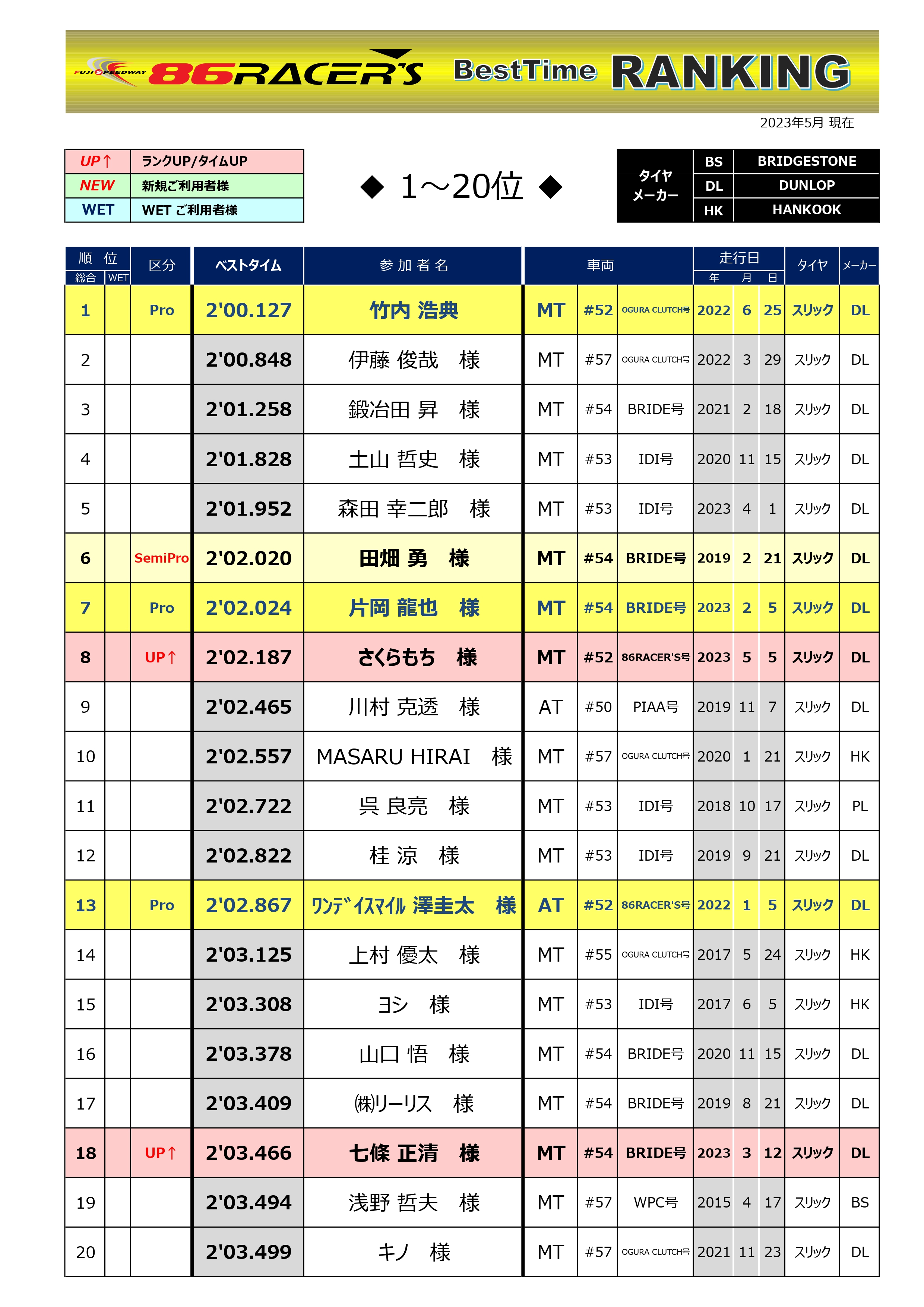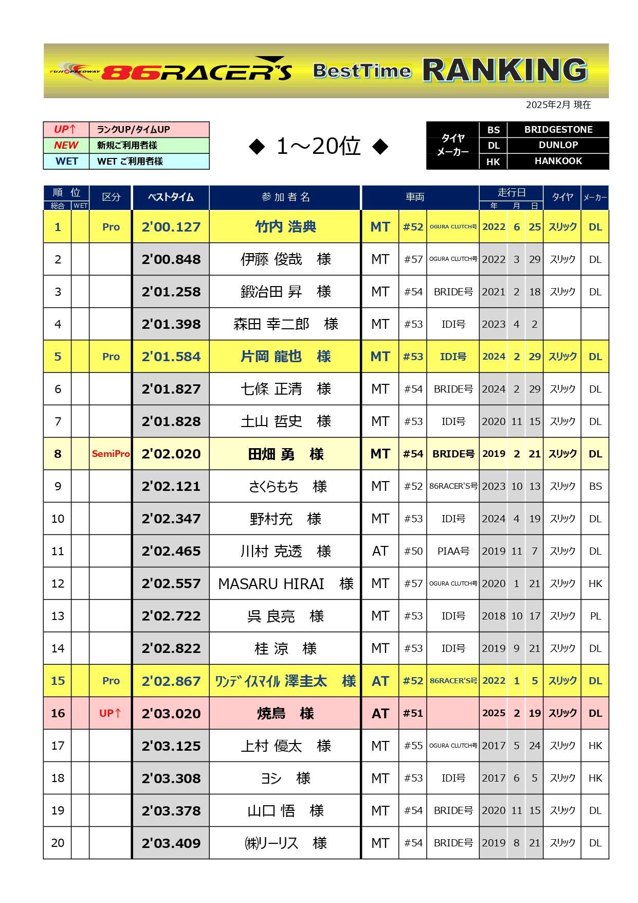 ※初回ご利用時は必ずNS-4枠またはT-4枠でご予約下さい。 S-4 :ラップタイムが2分10秒より速いペースで走行する方 NS-4:ラップタイムが2分00秒より遅いペースで走行する方 T-4 :最高速180km/h、ラップタイム2分20秒より遅いペースで走行する方(86レンタルはAT車両に限定) 走行枠は スポーツ走行月間スケジュール をご確認ください。 |