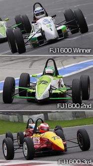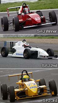 見た目はウィングが付いて少々大きくなっているS-FJと従来ながらのアメンボのような形をしたFJ1600の混走となっているこのシリーズ、富士SWのS-FJコースレコードを書き換えてポールを取ったのは43西本直樹。そこに9加藤智・77DRAGONとここまではS-FJクラスが続くが、その次に付いたのはFJ1600昨シーズンチャンピオンの1見栄張る週末派、FJ1600クラスのトップとなりそこに7高梨・0渡辺義人とFJ1600が続く。