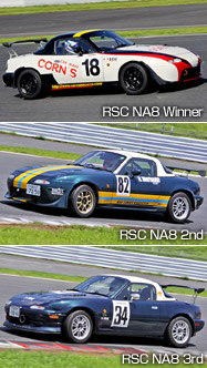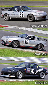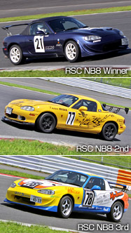 その大野に続いてゴールしたのは平野ながら、レース後にペナルティとして30秒が加算され、大きく順位を落としてしまう。その結果、新井がNB8クラスで2連勝を飾ることとなった。NB8クラスの2位は清水隆弘で、赤石沢清人の猛攻を最後まで凌いで2戦連続で表彰台に上がる。NA8クラスの2位は森脇晴紀で、こちらも2戦連続の2位に。総合では5位でフィニッシュした。