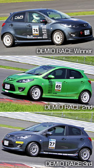 そしてデミオレースでは、前回初登場で初優勝を飾った望月大地が、またしても予選でトップ。だが、普段はデミオN1クラスを戦う近藤貴久が同タイムで並んでおり、余談はまったく許されない状況だ。オープニングの1周だけで1秒3のリードを築いた望月ながら、4周目からガクンとタイムが落ちて、次の周には近藤の逆転を許す。「コンピュータの補正がかかって回転が上がらなくなった」のが原因だ。トップに立った近藤は、そのまま逃げ切ってクラス初優勝。「思った以上に楽しいクルマだったので、来年は……」と近藤。