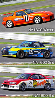 普段は5クラス混走での争いながら、今回はシルビアクラスのエントリーがなく、4クラスでの争いに。ポールはもちろんNA1600クラスから。小宮伸介が僅差でなかむらたかひろを従えた。だが、決勝ではなかむらが好スタートを切って、オープニングラップのうちにトップ浮上。「ギヤが入りにくくなって、そのうちアクセルあおれば入るのが分かったんですが、今度は油圧が上がってしまって」と苦境を背負いながらも2連勝となった。