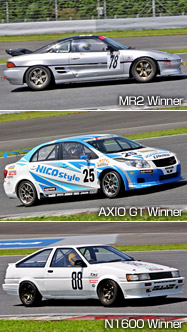 総合7位でフィニッシュし、一度もMR2クラスのトップを譲らず、前回よりひとつ順位を上げたのは谷田伸行。そして、N1600クラスでは牧口博亮がトップでチェッカーを受けたが、シビックEG6のため賞典外。AE86を駆る下平明彦の優勝となって、表彰台のてっぺんに立っていた。