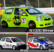 N1000クラスも最終ラップまで上位4台が一秒以内といったこれまたダンゴ状態で勝ったのは27新山、そこに54山田、39斉木と続いた。デミオでは103辻戸、55近藤の順。今シーズン全戦優勝でシリーズチャンピオンを決めた1雨宮は表彰台で「かなり嬉しい!年寄なんでいいかげんにしないとね〜」と笑いながらも「魅せるレースをしたいねと(表彰台の)三人で話していたけど、それが出来てとても良かった」と語っていた。