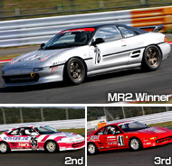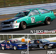 カローラアクシオクラスは、見た目では同時にチェッカーを受けたようにも見られる74と25だったが、0,056秒の差で74Takamori.comが嬉しい初優勝を飾った。さらにこちらも激しい争いのMR2クラスでは78谷田が35大石をおさえ優勝。N1600クラスでは100牧口が優勝するもEG6は章典外のレギュレーションで75朝倉潤司・40柳本文彦の順となった。