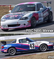 3クラス混走だがクラスごとに集団となりこちらもクラスごとにかなりの激戦となった。まずロードスターNA6クラスではスタート直後から混戦模様でスタート直後1コーナーまでに接触などがあるほどの激しいレース。1周目を終えてストレートに戻ってきたのは1雨宮恵司、65高橋和雄、4宮下進の順。その後徐々に1雨宮が引き離しにかかってきたと思われたが中盤から54高橋が何度もファステストラップを出しながら怒涛の追い上げにかかり、10周レースも残り一周となった9周目にヘアピンで65高橋が1雨宮を抜かしトップに立ちそのままチェッカーを受けた。