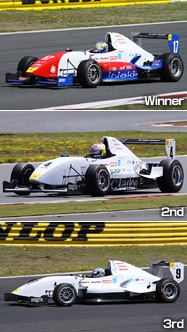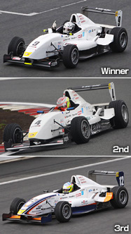 土曜日の予選で雨の中ポールを決めたのは50B-MAX-RK01-TODAの関口雄飛、ただ一人2分を切って堂々のポールポジション。日曜日の決勝でも好スタートから一歩も譲らなかったのはこの50関口、周回を重ねるごとにどんどん引き離して行くが、2番手・4番手争いがかなり接戦となった。前半は予選2番手からスタートの22SATO-ss.jp制動屋ミス 久保宣夫がキープしていたが、8GOLDEN ZAP006服部晃輔と56プロジェクトKKマースPFCの川口和希も予選7番手から徐々に順位を上げてくる。15周のレースを終えたときには、50関口、56川村、8服部の順位でチェッカーを受けた。