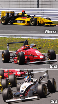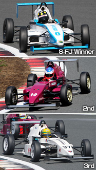 表彰台でOSAMUは「スタート1コーナーで前に出られて“やった!”という感じでした。武平選手はとても速かったですね」とベテランらしい余裕のコメント。そして3位の37 DRAGONが横から「次は絶対この二人をやっつけます!」と宣言。FJ1600クラス優勝のこちらも51歳川村は「歳ですが、まだまだ行きますよ!(決勝では)2台で寂しいので皆様もっと出てきてください」と話していた。