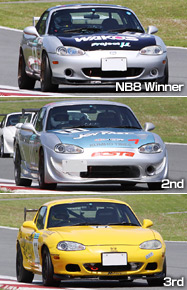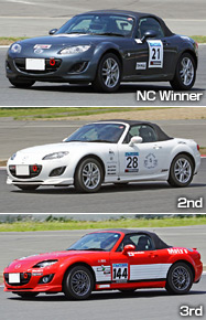 7茂木は「トップ三台が早いので、まさかそこから抜けられるとは思いませんでした。逃げることに慣れていないので難しかったですがとても嬉しいです」と話し、NB6の後藤は「まだまだですね。出来ることならNA6と良い勝負ができればと思っています」とコメント・デミオの47落合は「皆さんありがとうございます、ようやくここに立つことができました」と嬉しさをあらわしていた。