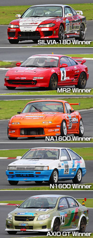 シルビア/180クラスでは2番手スタートの17トレジャーワン・アクレS15望月大地がオープニングラップでトップに出てそのままチェッカー、MR2ではクラス最後尾スタートの3MSPL制動屋MOTYSMR2 土取謙太郎が優勝、N1600とアクシオGTクラスではトップからスタートした240山口と14里山がそれぞれ優勝した。