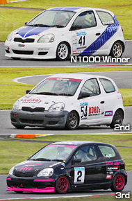 N1000クラスではポールの54山田と二番手スタートの41DCCマルチクラフトμヴィッツの佐藤英而と毎周にわたりバトルを繰り広げている、何度もトップが入れ代わる中、最終ラップで41佐藤が前に出てレースが終了した。1雨宮は表彰台で「作戦どおりに行きました。チームメイトなので1・2取れればいいなと。今年もチャンピオンを取れるように頑張ります」とチームメイト同士嬉しい表彰台。