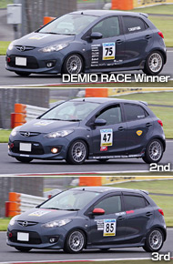 昼前に心配された霧の中、無事に決勝スタートが切られ、1周目には3番手スタートの15毛塚がトップでストレートを戻ってきた。一旦は3番手になったポールの321神谷も3周目には2番手を取り戻す、そのままレース後半でもこの2台が好バトルを繰り広げ、0.5秒差で先にチェッカーを受けたのは15毛塚だった。NB6では10桑野がそのままトップでチェッカー、デミオでは2番手スタートの75145デミオ改withSKRの西山隆が一周目にトップに立ちそのまま周回を重ね、チェッカーを受けた。