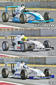 S-FJでは0LEYJUNディープレーシング10VのOSAMUと37B-MAX・RD10VのDRAGONがチャンピオン争い一騎打ちの形で向えた最終戦だが、ここに今年の鈴鹿S-FJチャンピオンが決定している10インターサポートRD10V戸田に乗る加藤智がスポット参戦をしてきている。その10加藤が予選でトップタイムをたたき出し、堂々のポールポジションからのスタート、そこに37 DRAGON、0 OSAMUと続く順番となった。