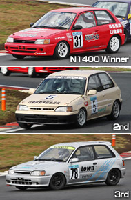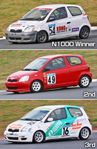 N1000クラスでは54山田が好スタートを決め1周目を終えた時点で5つポジションを上げ、さらに怒涛の追い上げを見せて、みごと優勝&シリーズチャンピオンを獲得した。2位は0.358秒差で49山口、3位は0.642秒差で采女が入った。僅差で勝利と同時にチャンピオンを手にした54山田は「ショップが良い車に仕上げてくれたので勝てました」と喜んでいた。