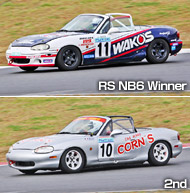まずロードスターではランキングトップの1雨宮恵司が今回は欠場。20ポイントの差で18コーンズIDIロードスターの大野俊哉が追っている状態。今回大野が優勝すれば、チャンピオンになれる。予選トップのポールポジションを取ったのは4+1アイマジックロードスターの宮下進、2番手に18大野がつけている。