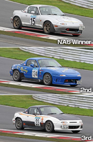ロードスターカップ NA6 / NA8 / NB8 第3戦 3クラス混走のこのカテゴリー、総合でポールポジションの座を射止めたのはNB8クラス1号車JoyアクレMotys☆NB8の戸田裕一、開幕2連勝でポイントリーダーだ。続いて2番手からスタートとなったのは、NA8クラストップの230号車samsμNA8ロードスターの石渡幸治、こちらも2連勝、NA6クラストップは総合7番手スタートの882号車K2R桑原精肉店IDINA6の杉岡尚人。