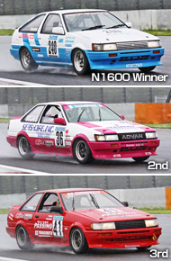 今回が開幕戦のAE111レビン/トレノ、今シーズンも全4戦で行われる。エントリーを見てもやはりベテラン勢が上位にきているが、マシンの成熟度やドライバーの腕前を見ても、今年も面白くなりそうだ。前日の予選でポールポジションを獲得したのは、7 C千葉千自総大エンドレスレビンの市丸聡で、昨シーズンのシリーズ3位のドライバー。そこに22 IDIマルヨシ・フルスロトレノの宮崎敏、78 藤和ケミカルTakadaトレノ 冥賀直文と続く。決勝は今大会最後のレースとなる16:15スタート。この時には愚図ついていたお天気も持ち直し、路面は完全にドライコンディションになっている。スタートで1コーナーを押さえたのは予選トップの7市丸、22宮崎、78冥賀の順、3周目に4位スタートの77SPM☆μ☆UETAKEトレノのなかむらたかひろが78冥賀を捕らえて3番手に上がってくる。レース中盤ではこの77なかむらがファステストラップを更新しながら5周目には2番手を走行している22宮崎の前に出た。後半も77なかむらと22宮崎の激しい2番手争いが各所で見られたものの、徐々に差を広げ、7市丸、77なかむら、22宮崎の順でチェッカーを受けた。 レース終了後7市丸は「レースもマシンもタイヤもきつかったです。前半のトップ争いからなんとか抜けて、後ろが2番手争いをしていてくれたおかげで勝てました。混戦の中での優勝なので、とても嬉しいです」と話していた。