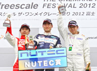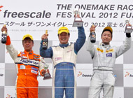 MUGEN POWER Cup CIVIC One Make Race Series 2012 第3戦無限パワーカップ シビックワンメイクレースシリーズ2012は全5戦中の今回が第3戦。予選でのトップは7オートバックスG-7HDCIVICの大西隆生、今回は表彰台常連が2番手グリットからのスタートとなりかなり白熱したレースになりそうだ。スタートを上手く決めたのはやはり4番手スタートでランキングトップの4 BRIDE・ED・PETRONAS・FD2の太田侑弥、1周を終えたところで2番手まで浮上。その後2周目にはトップに立ちそのまま逃げ切った。2位に入ったのは72サージェント・ED・EUROFD2の谷口行規、続いて88 SSR制動屋カーコンビニ88FD2の牧田克哉が予選12番手から3位表彰台。4太田は「上手くいきましたが後ろが谷口君だったのでとにかくミスをしないように走りました」とコメント。