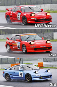MR2・NA1600・N1600シリーズの開幕戦、まず土曜日に雨の中行われた予選で総合トップになったのは、NA1600の37 四季の森歯科IDIウィナーG86の秋元優範、99バウアーハウスR・AE92 竹内秀伸が続く、MR2では3 MSPLアクレMOTYSMR2の土取謙太郎がトップ、N1600では240 ガレージアネックス・μ・レビンの山口崇がトップでそこに40 ASやなぎもとIDI86レビンの柳本文彦が続く。スターティンググリットはいつものように、NA1600クラスが1〜3列グリット、6列空けてMR2クラス、そこから8列空けてN1600クラスとなっている。各クラスマシンのスタートダッシュ性能を見越しての措置だが、レースが始まるとこれでも混戦になってくるのが混走レースの見どころだ。雨が降り続ける中決勝がスタート、1コーナーでポールスタートの37秋本と2番手スタートの99竹内がコースオフ。ここでトップに立ったのが3番手スタートNA1600クラス73 ウィナーグループIDIユーノスの小宮伸介。その後追い上げて前半こそ37秋元とバトルとなったが、レース中盤にもう一度73小宮がトップに立ったあとは徐々に引き離し、8秒差でチェッカーを受ける。MR2は3番手スタートの4 文祥堂アクレ柳本ダイエーMR2の阿部恵一がオープニングラップでトップに出るものの、すぐに3土取にその座を奪い返され、3土取、4阿部、26藤永の順でチェッカー、N1600は240山口がトップのままチェッカーを受け、そこに3番手スタートの36 SEASHOREアクレWレビンの大石重之が続き41中村が3位となった。このクラスも長年レースを続けてきている仲間達が表彰台常連なので、和気藹々のレース終了後コメントでは優勝した73小宮が「秋元さんが、師匠を立てて譲ってくれました」と笑いを誘った「でも実際は小雨が降っていたのでけっこう滑って大変でした」と楽しみながらも大変だったレースを振り返っていた。