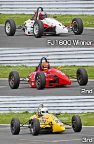 今大会で第3戦を迎えたSuper-FJ、FJ1600レース、S-FJのここまでのシリーズランキングは75B-MAXイエローダック10V 上別府将司が28ポイントでトップ、1ポイント差で昨年ダントツの速さでチャンピオンを取った1 LEYJUN筑波ガレージ10VのOSAMUが続き、第2戦で優勝した58 Rnスポーツ尾川KKS2制動屋 石川京侍が3位、今シーズンはまだまだ混戦の予感だ。FJ1600は今回出場していない99中嶋香子と12オートルックEVOLEX・SKの北野正規がそれぞれ20ポイントで同点トップ。土曜日に行われた予選でポールを取ったのは58 石川、そこに1 OSAMU、41 B-MAX・ED10Vの今井龍太、ポイントリーダーの75上別府は10番手からのスタート。FJ1600のトップはベテラン3 プロジェクトKKマースSK96の川村正徳がトップ、12北野は3番手からのスタートとどちらのクラスも面白いレースになりそうだ。決勝は日曜日の朝一番のレース、天候は曇り、気温21℃路面温度28℃のコンディションの中スタートがきられた。好スタートをみせたのは1 OSAMU、トップで1コーナーへきえて行く、ポールからスタートの58石川もそこに続くがなかなか抜けない、後ろの3番手争いも41今井と36太田達也が争っている。FJ1600では1周目にトップに立った12北野が順調に周回を重ねてそのまま優勝。S-FJは逃げ切った1OSAMUが優勝、58石川が2位、追い上げてきた75上別府が3位に入った。レース終了後S-FJ 1 OSAMUは「トップにたつものの後ろは引き離せないしとても疲れました」と話しFJ1600 10 北野は「スタートで上手く決まりS-FJの後ろについてスリップが上手く使えたので引き離すことが出来ました。すごく嬉しい」と話していた。