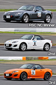 ロードスターカップNC・デミオレースも今回が開幕戦、ナンバー付き車両で行われる2車種の混走カテゴリーだ。このクラスは今回日曜日の朝、予選が行われて午後に決勝というスケジュールになっていた。予選でポールポジションを獲得したのは21 新井μおやぢRロードスターの新井敏克、続いて18 JOYMotysロードスター ランマン、64Joy☆abMoty’sNC 芝本淳。デミオクラスではトップが75 145デミオ改WithSKRの西山隆、24 MMレーシング&おやぢRデミオ オブチマサヒト、34 TR-Factoryデミオ 常盤岳史となっている。オープニングラップをトップで戻ってきたのは64芝本、21新井、18ランマンの順、しかし上位陣の争いは毎周回各所で続く、一旦3番手までなった21新井が周回を重ねるごとに徐々に追い上げ、7周目にはまたトップの座に戻り予選4番手から追い上げてきた8 ド☆ライダーロードスターの菊池聡がラストラップに2位まで追い上げ表彰台、3番手には64芝本というレース結果になった。デミオでは予選トップの75西山がそのまま逃げ切り2位以下に1’10.277の大差をつけて優勝、2位には85 WAKO’S高岸デミオが入り、34 常盤は3位になった。レース終了後21新井は「スタートでクラッチが上手くつなげられなくて遅れてしまった。失敗はしたけれども、追い上げがとても楽しかったです。暑くて疲れました」と汗だくになりながらも楽しかったレースを振り返っていた。デミオの75西山は「冬場にかなり練習を積んだので、その成果が出てとても嬉しいです。タイヤの選択などもすべて上手くいきました」とパーフェクトに上手く行ったレースを振り返って話していた。