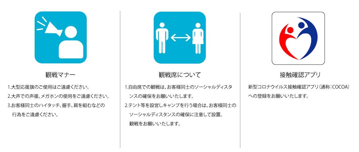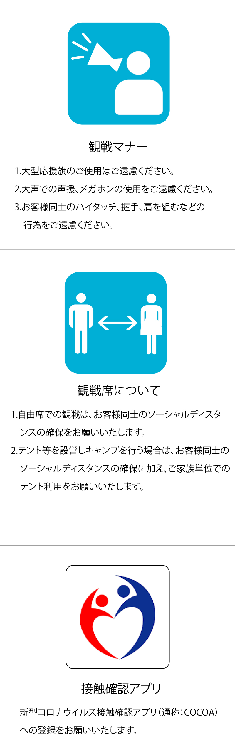 | 観戦場所 | A、Bパドックは関係者以外の立入りが規制されます。 それ以外のフリーエリアでご観覧下さい。 ※グランドスタンド、第1コーナーグランドスタンドは指定席ではございません。間隔を空けてご着席ください。 |