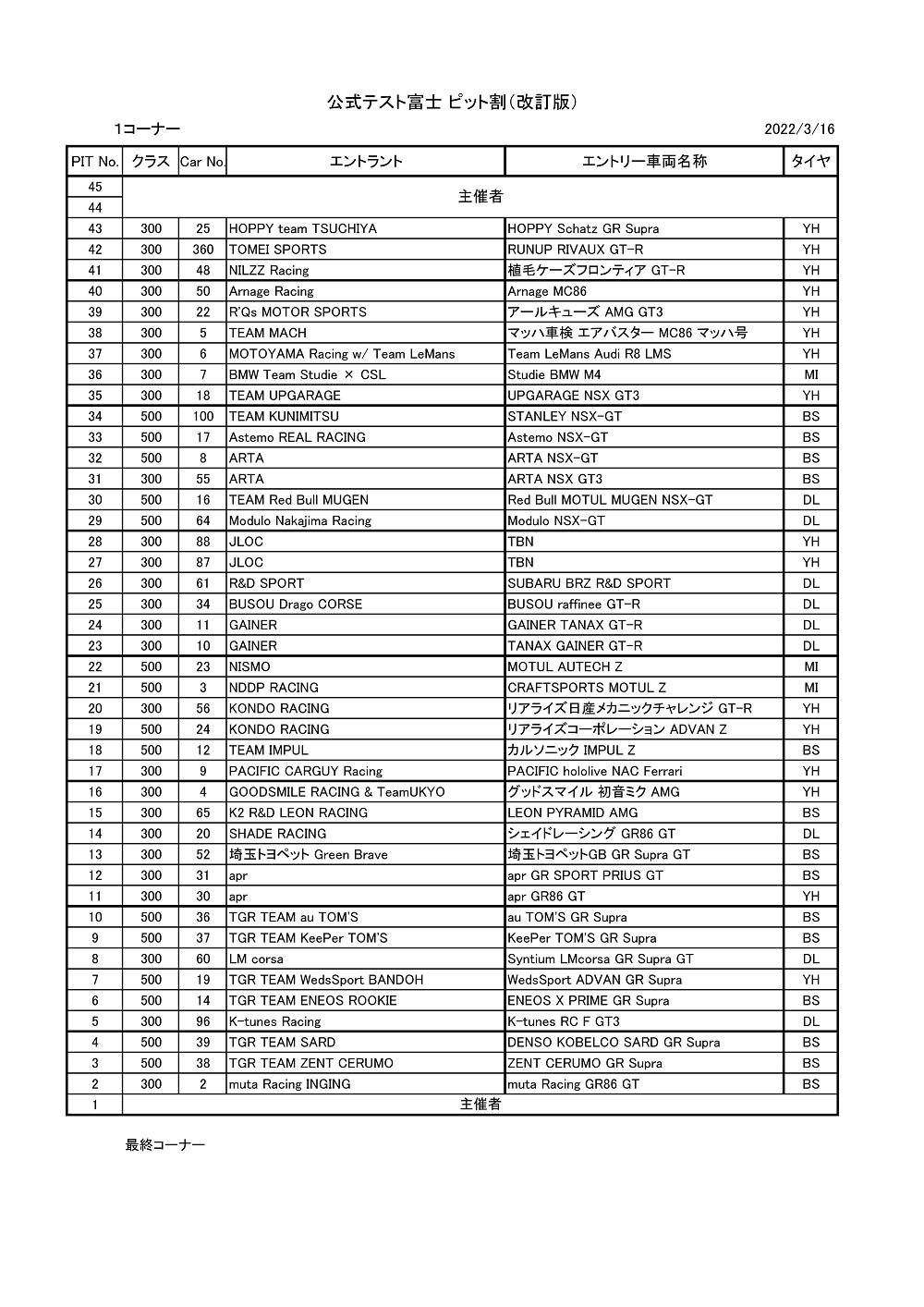 | 走行スケジュール(予定) | 2022年3月26日(土) / 10:00~12:00 / 14:00~ 2022年3月27日(日) / 9:30~11:45 / ※天候等の状況により走行時間は告知なく変更となる可能性がございます。 |