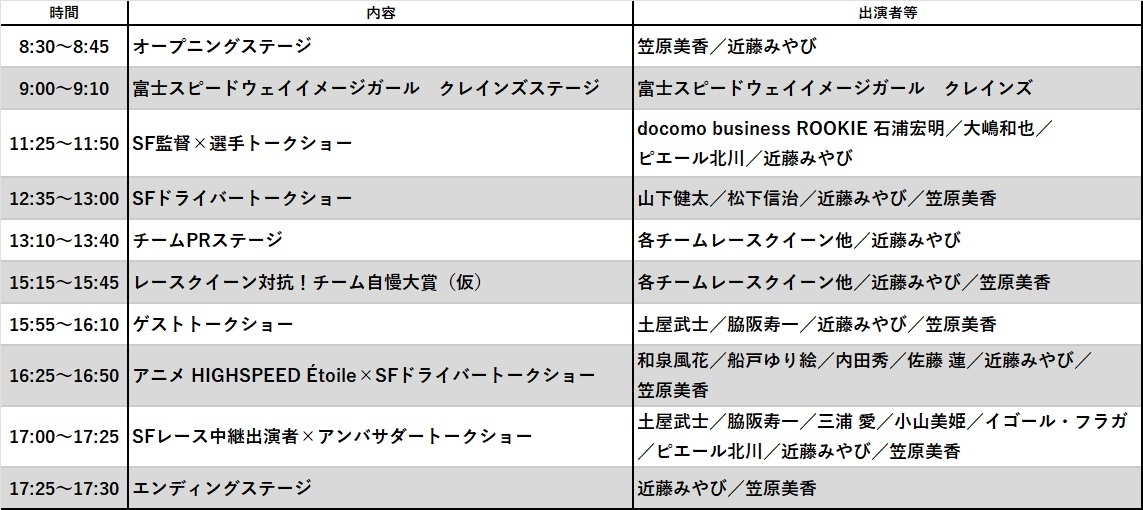 ブース内ではHIGHSPEED Étoile缶バッジ(全8種)をカプセルトイでの販売に加え、スーパーフォーミュラ夏祭りの一環として、さまざまな商品ゲットできるHIGHSPEED Étoileスタンプラリーを開催します! 友人や家族と会場内を巡りながらぜひスタンプラリーをお楽しみ下さい。 さらに、声優の和泉⾵花さん(輪堂凛役)、船⼾ゆり絵さん(プリマステラ 日向光莉役)、内⽥秀さん(プリマステラ 九頭竜明莉役)が来場し、SF NEXT50ステージでのトークショーも実施致します。