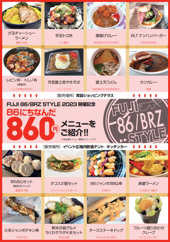 | 価格 | 86にちなんだメニュー 860円 SUBARU BRZにちなんだメニュー 610円 詳細は下記の画像をご覧下さい。 |