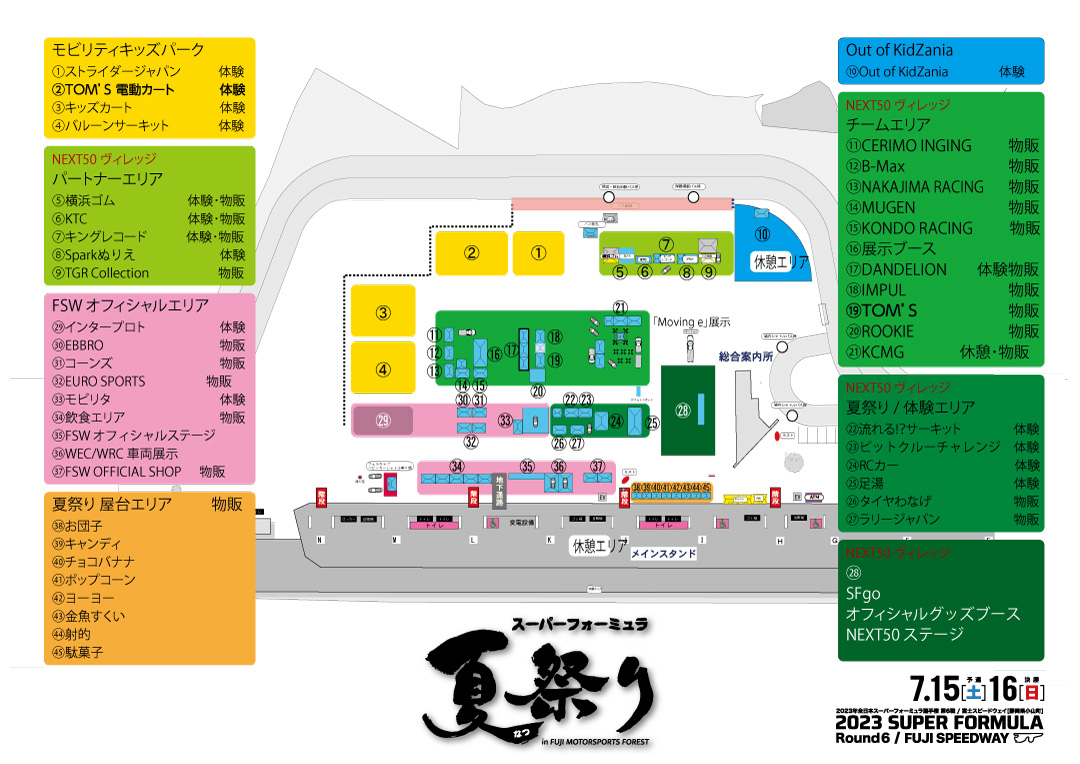 スーパーフォーミュラ(SF)に参戦する各チームがブースを出展。『JRP xホンダxトヨタ合同ブース』では、 ドライバー関連グッズやパネル展示をご覧いただけます。お目当てのチーム・ドライバーのグッズを購入したり、好きなドライバーを見つけたり、スーパーフォーミュラの情報をゲットできますので、是非お越しください。 今回は足湯コーナーも設置されますので、観戦の疲れを足湯で癒しましょう!