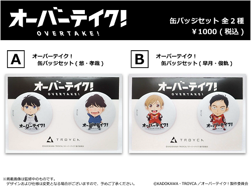 KADOKAWA×TROYCAオリジナルTVアニメ「オーバーテイク!」の先行上映に併せて、ミニキャラを使用した缶バッジセット(悠・孝哉)と(早月・俊軌)をイベント広場内、富士スピードウェイオフィシャルショップで先行販売が決定しました。