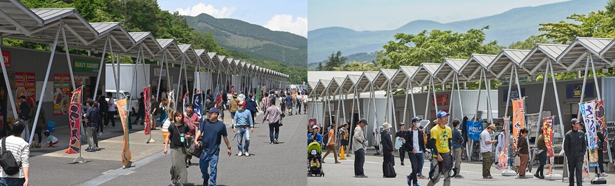グランドスタンド裏のショッピングテラスでは食事を提供してくれる店舗やミニカーやグッズを販売している店舗など、様々なショップが皆さんをお待ちしています。地元名物のグルメを販売しているショップもあるので、遠征で観戦にきた人は要チェックです!